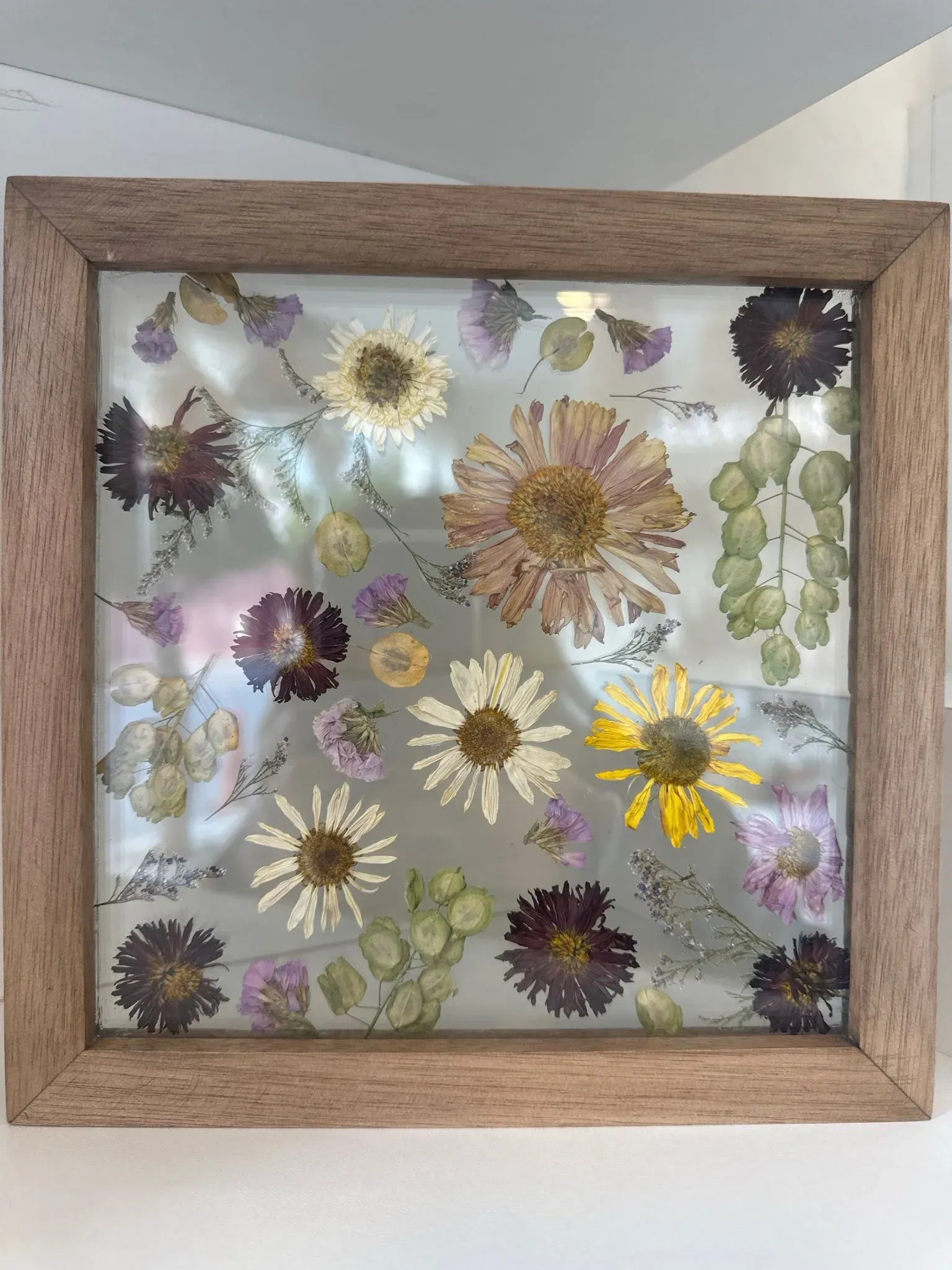 El cuadro está compuesto por una variedad de flores secas cuidadosamente recolectadas y preservadas que forman un mosaico de colores y texturas que capturan la esencia de la naturaleza en su plenitud.